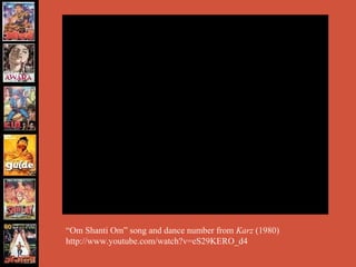 Om Shanti Om is a 2007 Bollywood film that uses extensive intertextual references and metafictional elements to comment on Bollywood cinema's history and conventions. Through remaking scenes and songs from the 1980 film Karz, and having the main character become an actor who witnesses his own murder, the film reflects critically on Bollywood's past eras while also holding a mirror to its present amid changes in Indian society and media. By deliberately calling attention to its own artificial nature and compositional elements, Om Shanti Om engages in metalepsis to reveal how texts are constructed and comment on genre.