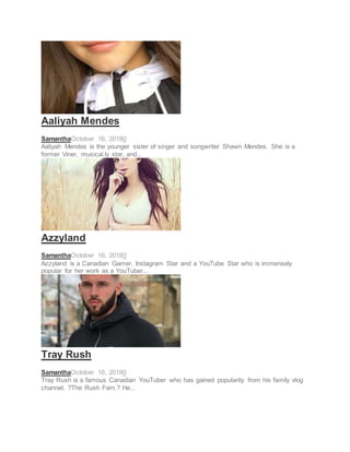 This document contains short biographies of various actors, singers, social media stars and hosts. It includes biographies of Sila Hussain, Robbie Amell, Atticus Mitchell, Corey Haim, Ramez Galal, Amy Samir Ghanem, Suad Nasr, Torri Webster, Kid Buu, Mike Myers, Germaine, Núria Gago and Cuca Escribano. Each biography provides basic details about the person's profession, nationality and some of their notable works.