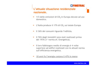Il documento analizza l'importanza del risparmio energetico e dell'isolamento termoacustico nel settore edilizio italiano, evidenziando che un terzo delle emissioni di CO2 in Europa proviene dall'uso domestico. Viene sottolineato il fabbisogno energetico degli edifici più vecchi, che è significativamente superiore rispetto a quelli realizzati secondo le attuali normative di efficienza energetica. Infine, il documento menziona l'adeguamento della norma UNI 7697 del maggio 2014, riguardante la sicurezza nelle applicazioni vetrarie, con nuove disposizioni per i vetri installati a più di un metro dal suolo.