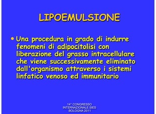 Il documento descrive l'uso di una cannula fredda e di tecnologie ultrasoniche nel trattamento dell'adiposità localizzata mediante lipoemulsione. Viene evidenziato il meccanismo d'azione degli ultrasuoni e i diversi tipi di cavitazione, oltre ai protocolli di trattamento, indicazioni e controindicazioni. Si conclama l'efficacia e la sicurezza della procedura nel migliorare la qualità dei tessuti e nel ridurre il volume adiposo senza danneggiare le strutture vascolari circostanti.
