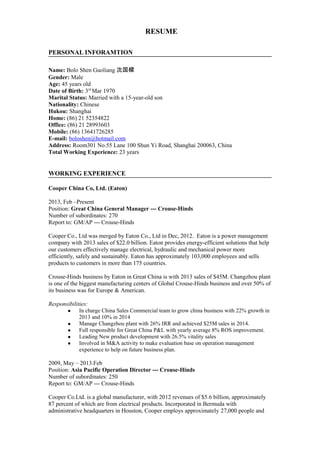 This resume summarizes Bolo Shen Guoliang's professional experience. He is currently the Great China General Manager at Cooper China Co., Ltd., where he oversees 270 employees. Previously he held leadership roles at Cooper Co., Delphi Packard Electric Systems, and Tyco Electronics AMP Co., managing production, quality assurance, and Asia Pacific operations. He has over 23 years of experience in manufacturing management.
