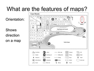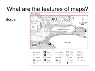 Maps have several key features including a border, orientation that shows direction, a legend that explains symbols, a title naming the place represented, and a scale showing the relationship between map units and real-world lengths.