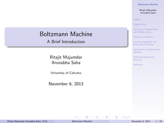 The document provides an overview of Boltzmann Machines and their relation to Hopfield Nets, covering their structure, learning algorithms, and applications. It discusses the importance of the global energy function and how hidden units in stochastic Hopfield nets can enhance functionality. Additionally, it addresses the challenges of local minima and introduces simulated annealing as a solution for escaping shallow minima.