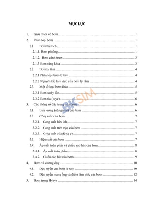 Tài liệu trình bày về bơm, phân loại chúng thành bơm thể tích, bơm ly tâm và bơm đặc biệt, cùng với nguyên lý làm việc của từng loại. Nó cũng đề cập đến các thông số đặc trưng của bơm như lưu lượng, công suất và hiệu suất. Cuối cùng, tài liệu mô tả ứng dụng bơm trong hệ thống HYSYS và các thông số liên quan đến thiết kế và hiệu suất của chúng.