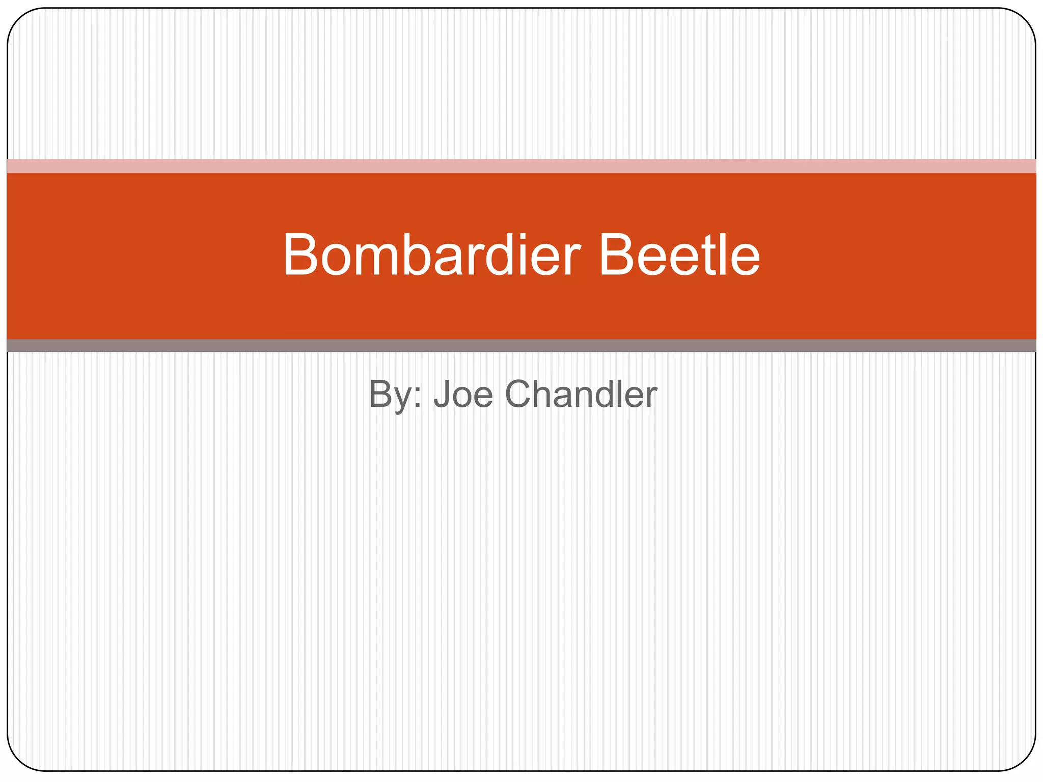 The bombardier beetle is able to shoot out a boiling liquid from its abdomen using an exothermic chemical reaction. It stores hydrogen peroxide in one compartment and hydroquinone in another, and when these two chemicals mix together along with a catalyst, the reaction creates gas pulses that propel the hot liquid outward for protection without harming the beetle. The reaction forms benzoquinone, water, and releases heat equal to the temperature of boiling water.