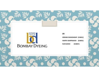 The document discusses Bombay Dyeing's business overview, financial performance, key questions, hypotheses, strategies and recommendations. It provides an industry and company overview of Bombay Dyeing. It analyzes the company's financial data from 2013-2018, including revenues, profits, assets/liabilities. It identifies key questions around future profitability and addressing young customers. It lists hypotheses around capital, demand growth and raw materials. It outlines strategies like expanding stores, new products and markets. Recommendations include increasing digital sales, international designer partnerships and ready-made garments.