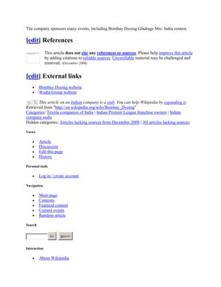 Bombay Dyeing is an Indian textile company established in 1879 and headquartered in Mumbai. It is the flagship company of the Wadia Group and chaired by Nusli Wadia. Bombay Dyeing was involved in controversies with Reliance Industries and a jute company. It sponsors the Bombay Dyeing Gladrags Mrs. India beauty pageant.