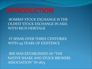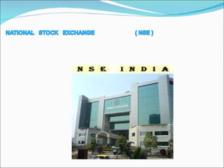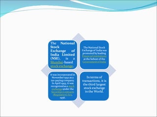 The document provides information about the Bombay Stock Exchange (BSE) and National Stock Exchange (NSE) of India. BSE is the oldest stock exchange in Asia, established in 1875. NSE was established in 1992 as a nationwide trading facility to ensure equal access to investors. It has become the largest stock exchange in India in terms of market capitalization. The document also describes key stock market indices of India - the BSE Sensex and NSE Nifty 50, which track the performance of major companies listed on the two exchanges.