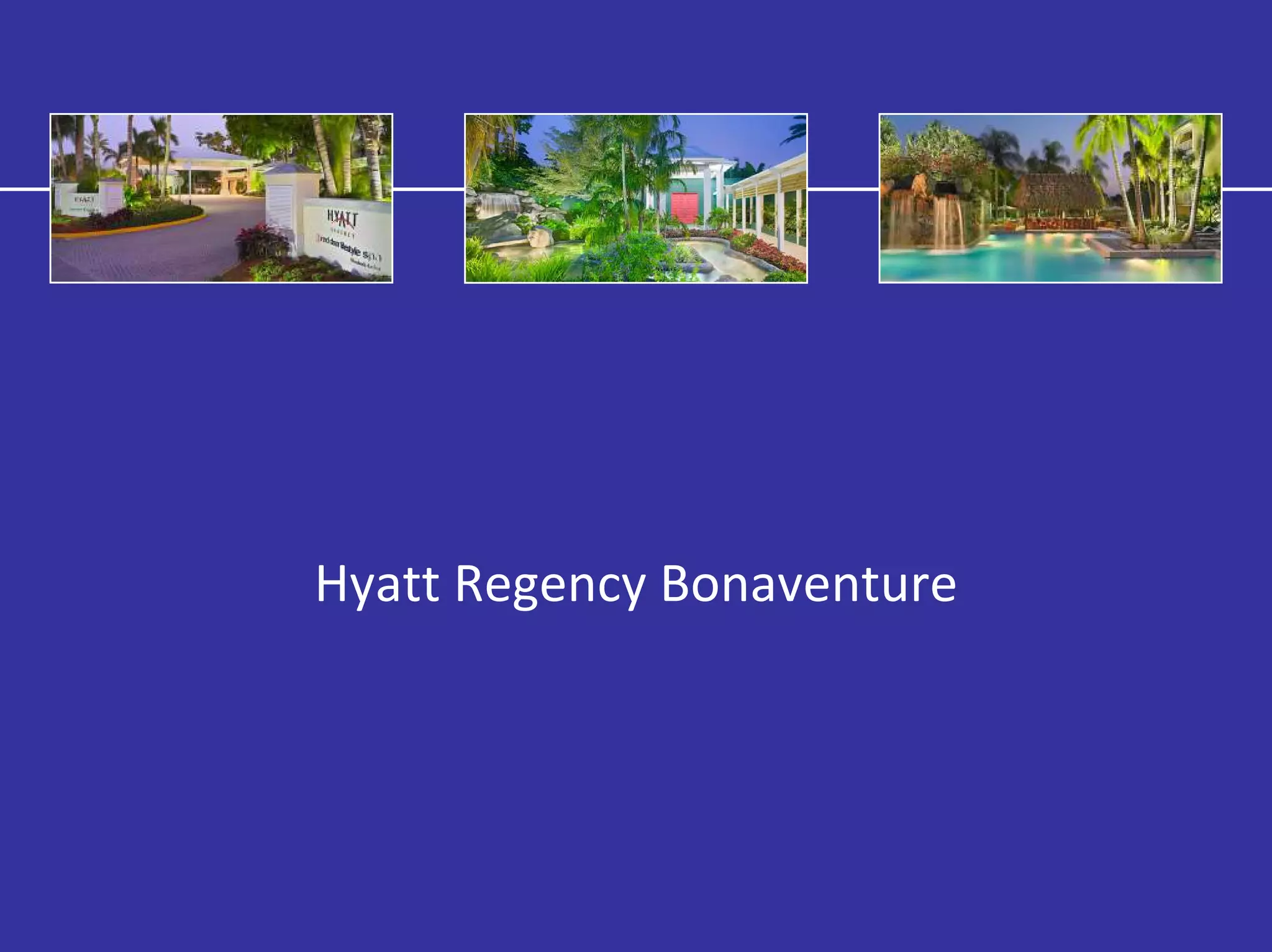 The Hyatt Regency Bonaventure is located in Weston, Florida near the Miami and Fort Lauderdale airports. It has 501 guest rooms including 110 suites. Meeting space includes three large ballrooms and a 60,000 square foot conference center. On-site amenities include a 48,000 square foot spa, fitness center, pools, and multiple dining options like the AAA Four Diamond Ireland's Steakhouse. The hotel is surrounded by landscaping, water features, and is adjacent to the Bonaventure Golf Club.