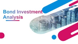- Key bond risk factors are discussed like default risk, interest rate risk, and reinvestment risk. Bond immunization strategies are also summarized which aim to minimize interest rate risk by matching duration.