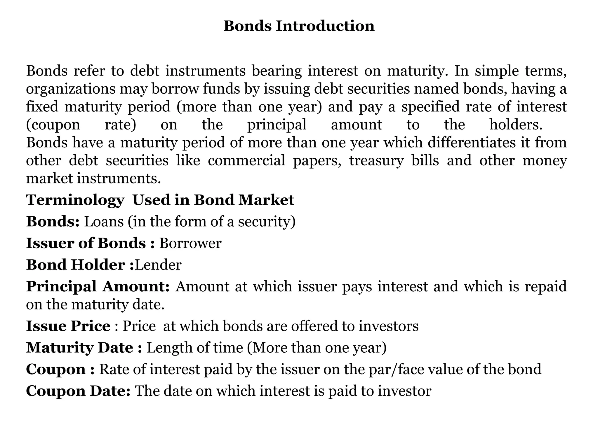 Bonds are debt instruments issued by organizations to borrow funds from investors. Bond holders loan principal to the issuer and receive regular interest payments at fixed coupon rates until the bond's maturity date, when the principal is repaid. There are various types of bonds including zero coupon bonds, which are issued at a discount and gain value over time without interest payments; floating rate bonds, where the coupon rate fluctuates with a benchmark; convertible bonds, which allow holders to convert bonds into equity; and amortizing bonds, where the issuer repays portions of principal along with interest over the life of the bond. Bonds provide investors with stable, fixed returns while giving issuers access to lower-cost funding to support business operations and government