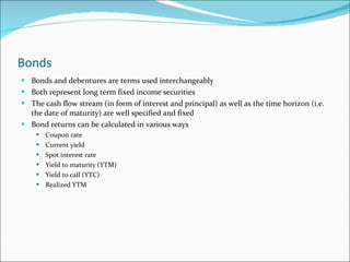 The document discusses various bond valuation concepts like coupon rate, current yield, spot interest rate, yield to maturity, yield to call, and realized yield. It provides examples to calculate these measures and explains how bond prices are determined based on factors like interest rates, time to maturity, and cash flows. Bond duration is introduced as a measure of interest rate risk exposure, and bond risks from default and changes in interest rates are explained.