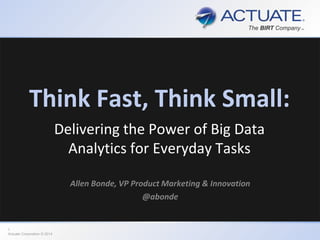 The document emphasizes the need for efficient customer analytics that can leverage big data from various sources, specifically tailored for departmental business analysts rather than data scientists. It advocates for timely responses in minutes and highlights the 'small data' approach that connects users with meaningful insights, making them actionable for daily tasks. Key requirements include fast data access, pre-built algorithms, and built-in workflows.
