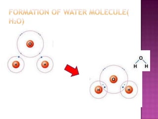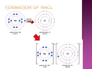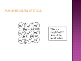 The document discusses different types of bonding: ionic, covalent, and metallic. Ionic bonding involves the transfer of electrons between metals and non-metals to form ions. Covalent bonding involves the sharing of electron pairs between non-metals. Metallic bonding involves a sea of delocalized electrons that are attracted to cationic metal ions arranged in a lattice. Each type of bonding results in different material properties depending on whether electrons are transferred, shared, or free to move.