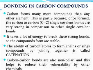 This document discusses carbon bonding and the formation of carbon compounds. It explains that carbon can form strong covalent bonds with other carbon atoms through a process called catenation, allowing it to form straight chains, branches, and rings. This bonding ability arises because carbon is tetravalent and can hybridize its orbitals, taking on different hybridization states like sp, sp2, and sp3. Some carbon compounds exhibit resonance, where electrons are delocalized over multiple carbon atoms. This results in more stable structures that are hybrids of different resonant forms. Overall, carbon's unique bonding properties allow it to form a diverse array of stable organic compounds.