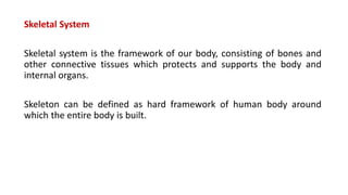 The skeletal system consists of bones and other connective tissues that provide structure and protect internal organs. Bones are composed of both organic and inorganic materials, including collagen proteins and hydroxyapatite salts. The skeletal system includes long bones in the limbs, short and flat bones, and irregular bones like those in the spine. Bones are living tissues that contain osteoblasts, osteocytes, and osteoclasts, which form, maintain, and break down bone respectively. The skeletal system provides structure, movement, protection, mineral storage, and blood cell formation.