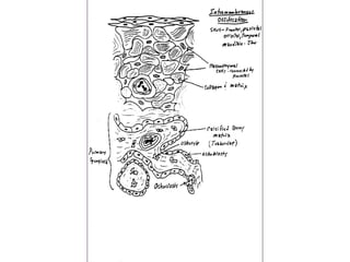 Bone is a connective tissue composed of cells and fibers embedded in a mineralized substance. It provides structural support and protection for the body. Bone tissue contains osteoblasts that form new bone, osteocytes embedded in the bone matrix, and osteoclasts that resorb bone. The bone matrix is made up of collagen fibers mineralized with hydroxyapatite crystals. Microscopically, bone is composed of concentric lamellae that form osteons in compact bone or a trabecular structure in spongy bone.