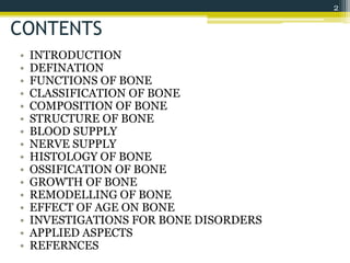 This document provides an overview of bone anatomy and physiology. It defines bone, describes its various functions, and classifications including by position, shape, development, and structure. The document discusses the composition of bone, including its organic and inorganic components. It describes the anatomy of bone including its blood and nerve supply. Finally, it provides details on the histology of bone, the different cell types involved in bone formation and resorption, and the processes of ossification and bone remodeling throughout life.