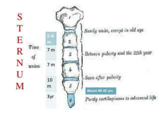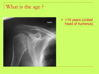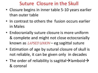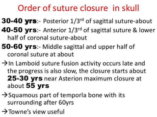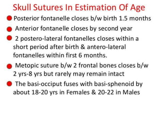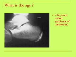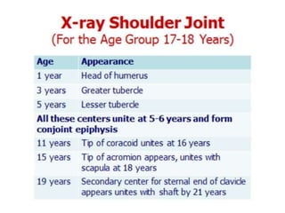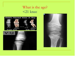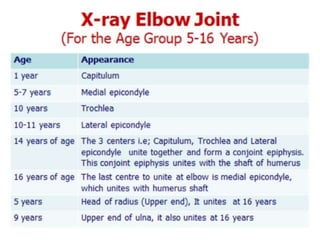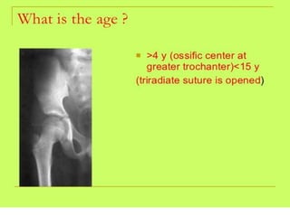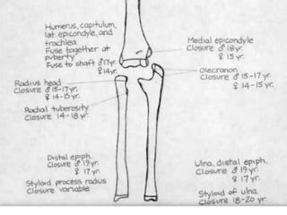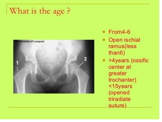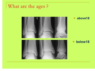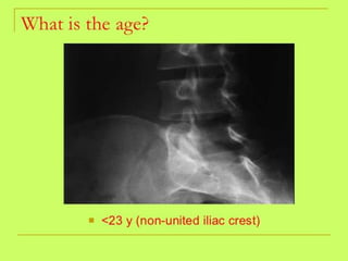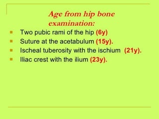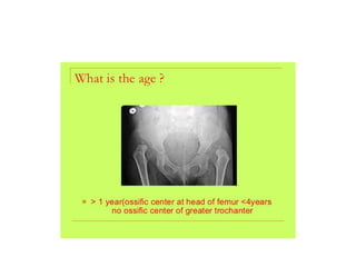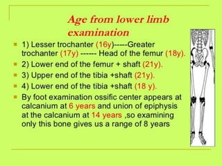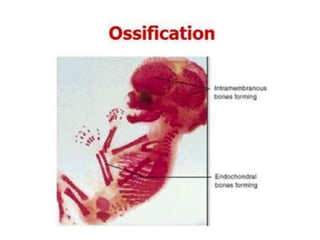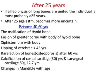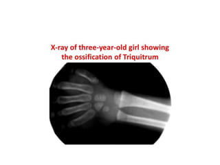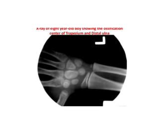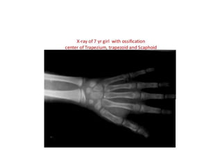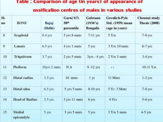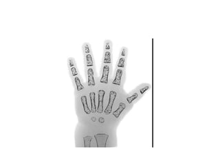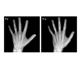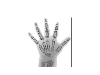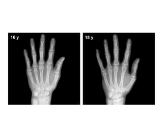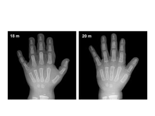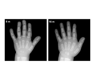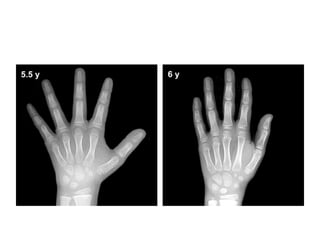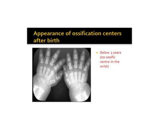 This document discusses bone age assessment and skeletal maturity. It begins by explaining that bone age assessment is used to evaluate growth and diagnose endocrine disorders. It then describes the processes of endochondral and intramembranous ossification that govern bone development. Several key indicators of skeletal maturity are highlighted for different age groups from infancy to post-puberty. Bone age assessment is used to diagnose growth disorders and predict final adult height.