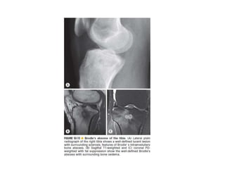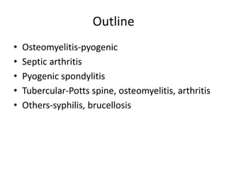 This document discusses bone and joint infections. It begins by classifying infections as either pyogenic (bacterial), tuberculous, or other causes. Osteomyelitis is defined as a bone infection that can be caused by bacteria, fungi, parasites or viruses. Symptoms of osteomyelitis can be acute, subacute, or chronic. Common sites of bone infection in children are the metaphysis around the knee. Imaging plays an important role in diagnosis, with plain radiography, CT, MRI, bone scans, and ultrasound all discussed. Biopsy may be needed to confirm infection and identify the organism. Brodie's abscess, a characteristic subacute pyogenic bone infection, is also mentioned.