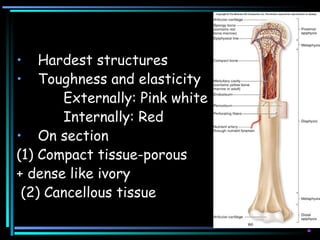 Bone is composed of compact and cancellous tissue. Compact tissue is dense like ivory while cancellous tissue is elastic and porous. Microscopically, bone is made up of lamellar and woven structures. Lamellar bone is strong with slow turnover found along lines of stress. Woven bone is immature and non stress-oriented found in embryonic skeletons. The periosteum encloses bone, supplying blood vessels in two layers. Bone marrow is yellow and fatty in adults but red and cellular in children. Bone is vascularized by nutrient arteries that branch throughout and emerge as veins in three locations.