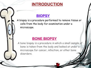 The document discusses bone biopsy and decalcification. A bone biopsy is performed to remove a small bone sample, which is examined under a microscope to diagnose bone disorders like cancer or infection. It can be done with a closed needle biopsy or open biopsy requiring anesthesia. Bone decalcification involves removing calcium from bone samples using acid solutions, ion exchange resins, or chelating agents so the bone is flexible and can be examined microscopically. Common decalcifying agents discussed are nitric acid, formic acid, and EDTA.