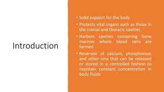This document discusses the histology of bone. It describes bone as a specialized connective tissue composed of cells, an organic matrix, and inorganic minerals. The main cell types are osteoprogenitor cells, osteoblasts, osteocytes, and osteoclasts. Bone has two types of tissue - compact bone which is dense, and cancellous or spongy bone found deeper within bones. Microscopically, bone is made up of concentric rings called osteons surrounding central canals, with osteocytes housed in lacunae between lamellae. This detailed structure allows for nutrients and waste exchange to support the living cells.