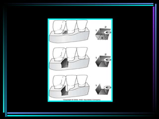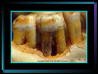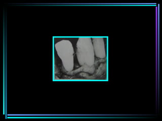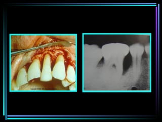 The document discusses bone loss patterns in periodontal disease. It notes that the balance between bone formation and resorption maintains bone height and density under normal conditions. The most common cause of bone destruction in periodontal disease is the extension of gingival inflammation into the supporting bone and tissues. This can lead to horizontal bone loss when inflammation travels along the bone crest or vertical bone loss when it travels directly into the periodontal ligament space. Bone destruction patterns include osseous craters in the interdental bone, bulbous bone contours, reversed architecture with loss of interdental bone, and furcation involvement in multi-rooted teeth.