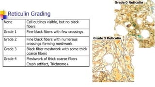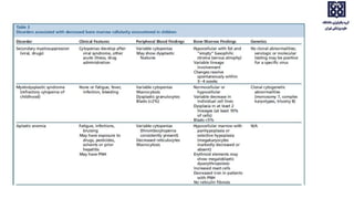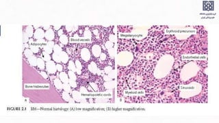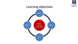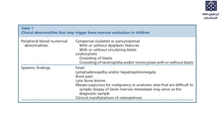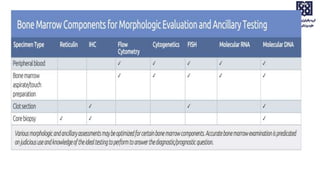 Bone marrow examination is indicated for investigating unexplained blood abnormalities, diagnosing hematopoietic neoplasms, infectious disease workup, evaluating storage disorders, and staging lymphomas or other cancers. An adequate bone marrow aspirate requires at least 3 particles per slide and 4 slides total, while an adequate trephine biopsy is at least 1.6 cm long. Bone marrow specimens are evaluated for cellularity, morphology of cells, immunohistochemistry, cytogenetics, and iron staining as needed. Cell distributions and accessory structures like osteoblasts are also assessed.