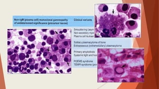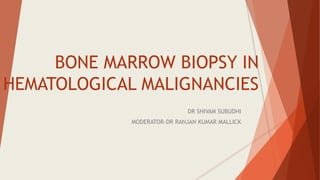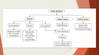 Bone marrow biopsy is useful for diagnosing and managing hematological diseases. It evaluates cellularity, fibrosis, and infiltrative disease. Indications include assessing marrow cellularity, suspected focal lesions, aplastic anemia, myeloproliferative neoplasms, lymphomas, multiple myeloma, and amyloidosis. Adequate biopsies are 1.5-2 cm in length with 5-6 trabecular spaces and 4 micron sections. Bone marrow biopsy along with aspiration helps diagnose conditions like acute leukemias, myelodysplastic syndromes, myeloproliferative neoplasms, lymphomas, and plasma cell neoplasms through assessing cellularity, infiltrates, and special stains.