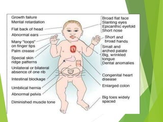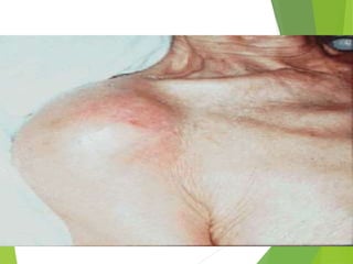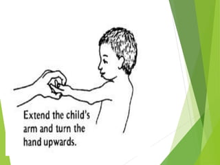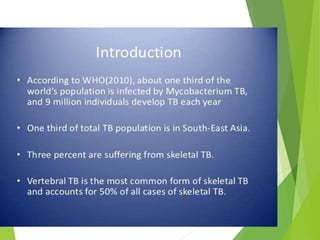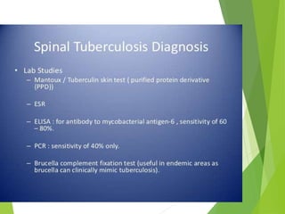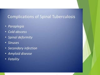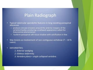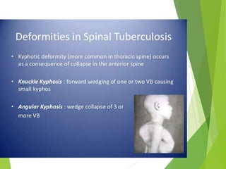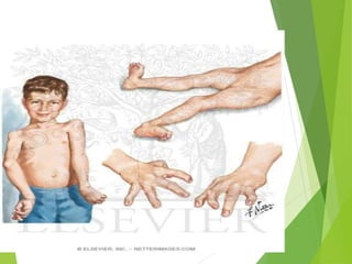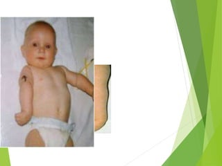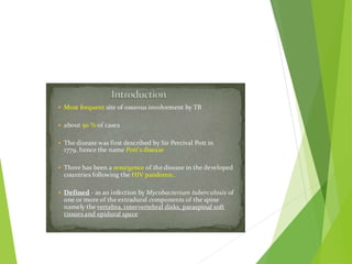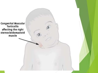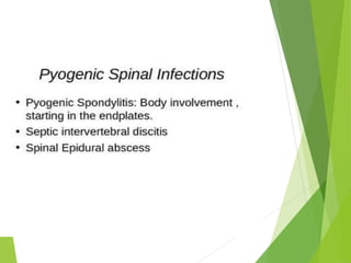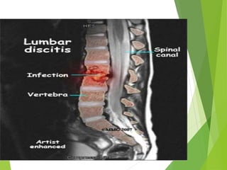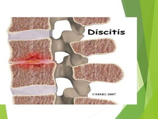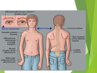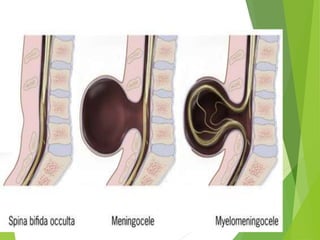 Myelomeningocele is a type of spina bifida where the backbone and spinal canal do not fully close before birth, resulting in a sac-like protrusion of the spinal cord and meninges through the defect. It is the most common and severe type of spina bifida and can cause paralysis, loss of bladder/bowel control, and other neurological issues. Discitis is an infection of the intervertebral disc that causes severe back pain and lack of mobility. Erb's palsy is paralysis of the arm caused by injury to the brachial plexus nerves during difficult childbirth, resulting in weakness and loss of movement in the arm.