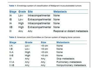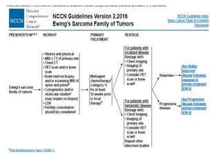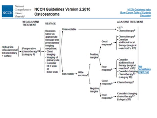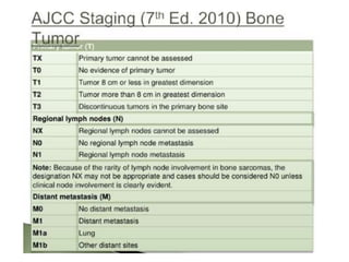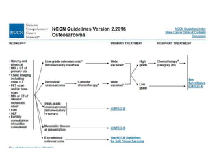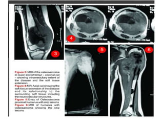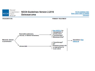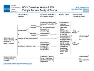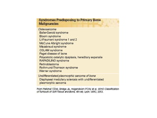 Ewing sarcoma and osteosarcoma are two of the most common primary bone cancers in children and adolescents. Ewing sarcoma accounts for about 2% of childhood cancers and most often affects bones of the pelvis, femur, and ribs in the second decade of life. The most frequent genetic abnormality in Ewing sarcoma is a translocation between chromosomes 11 and 22. Osteosarcoma is the most common primary bone tumor in children and makes up about 4% of childhood cancers, typically affecting the distal femur, proximal tibia, and proximal humerus. Both cancers commonly present with pain and swelling and can metastasize to the lungs. Treatment involves chemotherapy, surgery, and sometimes radiation.