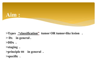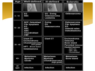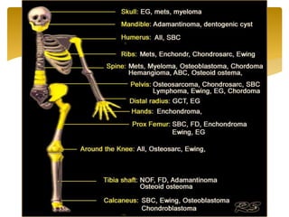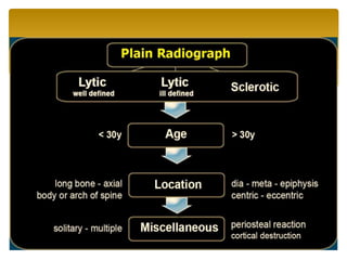 1. The document discusses diagnosis and treatment of various bone tumors and tumor-like lesions. Imaging techniques like x-rays, CT scans, MRI, and biopsies are used to diagnose lesions and determine if they are benign or malignant.