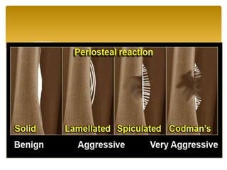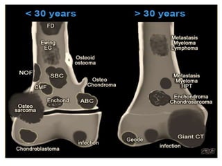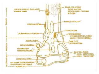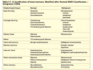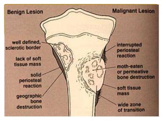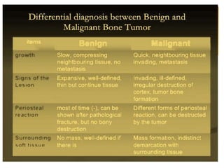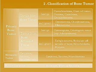 2. Both benign and malignant bone tumors are discussed. Common benign tumors include osteoid osteoma, fibrous dysplasia, and enchondroma. Primary malignant tumors covered are osteosarcoma, chondrosarcoma, and Ewing's sarcoma.
