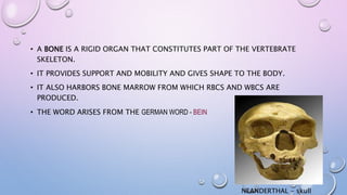 Bones provide structure and support to the body. They originally evolved from cartilage and first appeared as exoskeletons in invertebrates like snails. Over time, bones developed into endoskeletons in vertebrates. Bone tissue is a hard connective tissue composed of an organic bone matrix and mineral deposits. Bones can be classified as compact or cancellous, and bone formation occurs through two processes - intramembranous and endochondral ossification. Fractures disrupt the continuity of bones, and healing restores integrity through primary or secondary methods involving callus formation. Skeletonization is the final stage of decomposition where only bones remain.