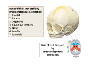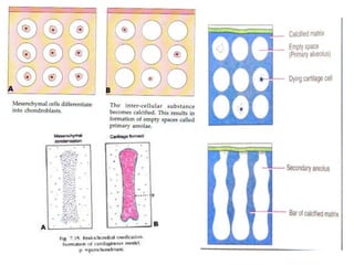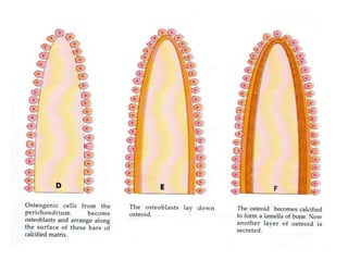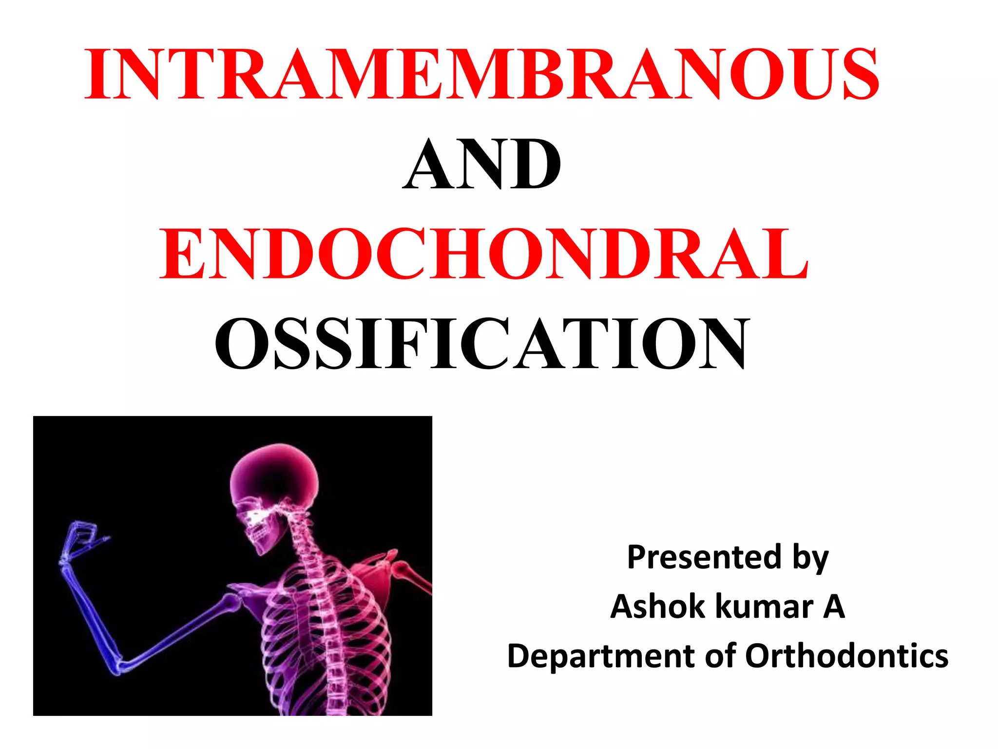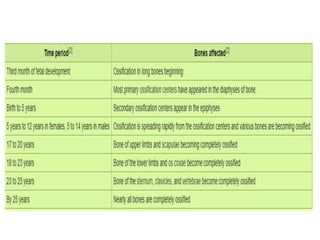The document discusses the processes of intramembranous and endochondral ossification, the classification and structure of bone, as well as the cellular components involved in bone development. It outlines the mechanics of ossification, including the primary and secondary centers of ossification, and provides insights into applied anatomy and related disorders. The conclusion emphasizes the dynamic nature of bone, highlighting the balance between bone formation and resorption in disease contexts.