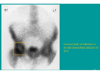 The bone scan is a nuclear medicine procedure that uses radiopharmaceuticals like technetium-99m to generate images of the skeletal system. It is useful for evaluating bone disorders and can detect abnormalities earlier than other imaging modalities. The scan involves injection of the radiotracer and acquisition of blood flow, blood pool, and bone scan phase images over hours. It is helpful for detecting fractures, metastases, infections and other bone abnormalities. Precise diagnosis may require correlation with clinical history and other imaging tests.