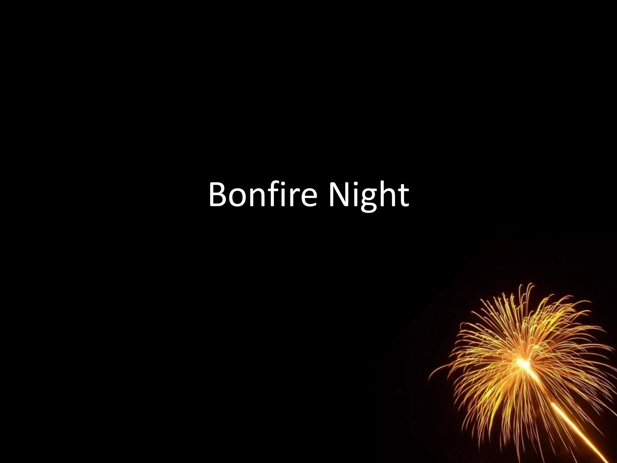 Bonfire Night commemorates the failed Gunpowder Plot of 1605, when a group of 13 Catholic conspirators plotted to blow up the Houses of Parliament in London. Guy Fawkes was found in the cellar under the House of Lords guarding 36 barrels of gunpowder, intending to kill King James I. Now every November 5th, bonfires are lit and fireworks set off in Britain to celebrate Guy Fawkes' failed assassination attempt. People often burn effigies of Guy Fawkes on the bonfires.
