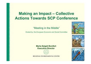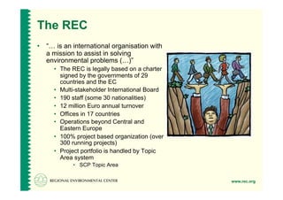 The document summarizes information from a conference on collective actions towards sustainable consumption and production. It discusses the Regional Environmental Center for Central and Eastern Europe (REC), which works on environmental projects in Europe and beyond. Some key points made in the document include: