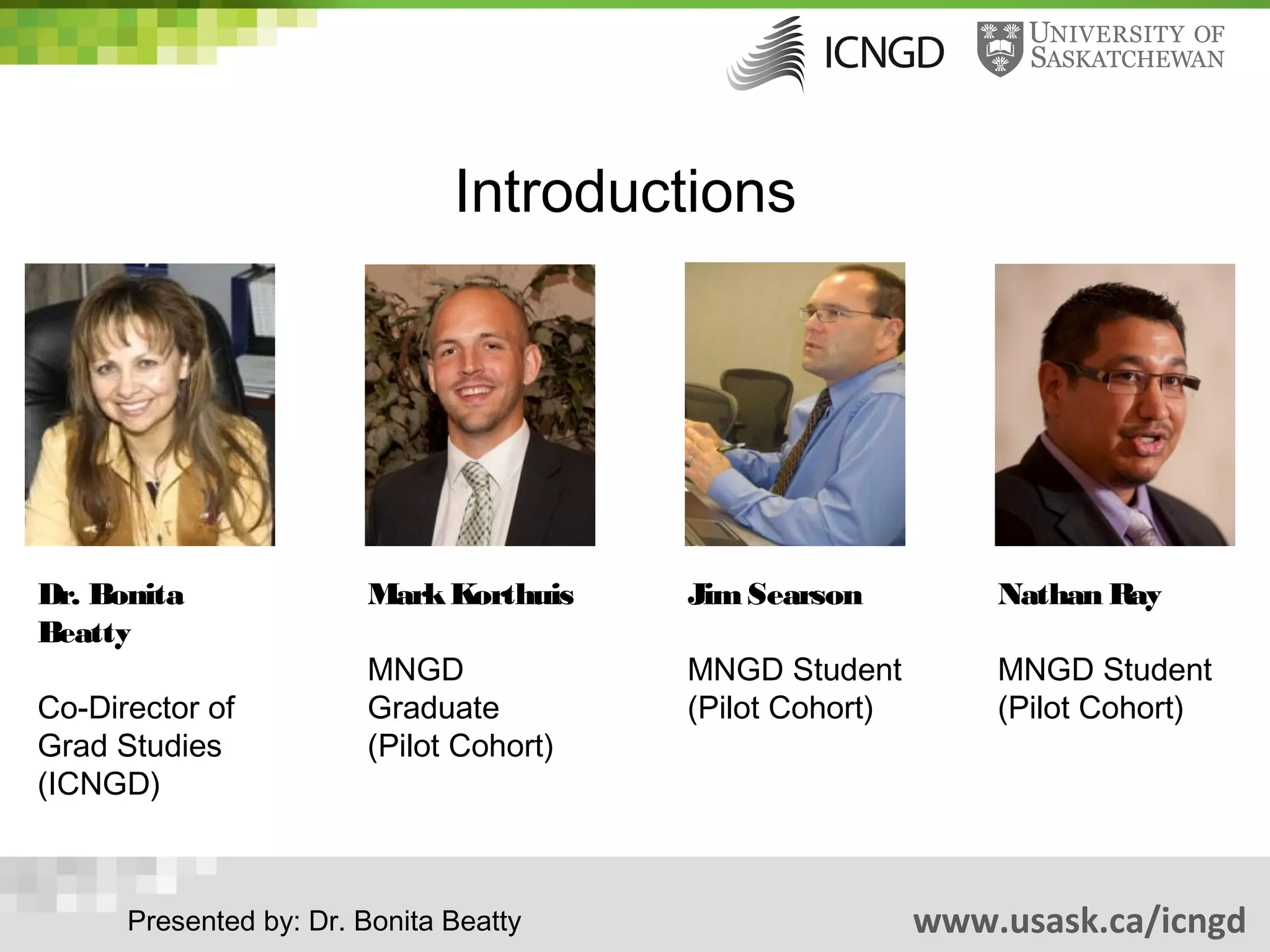 The document provides an overview of the Master of Northern Governance and Development (MNGD) program presented by the International Centre for Northern Governance and Development. The MNGD program was developed in response to the needs of northern partners and is designed to train the next generation of northern leaders. It utilizes a blended distance education model and professionalized cohort model to provide specialized, interdisciplinary training while incorporating Indigenous perspectives and international collaboration. Students conduct applied research internships to gain experience addressing real issues in the North.