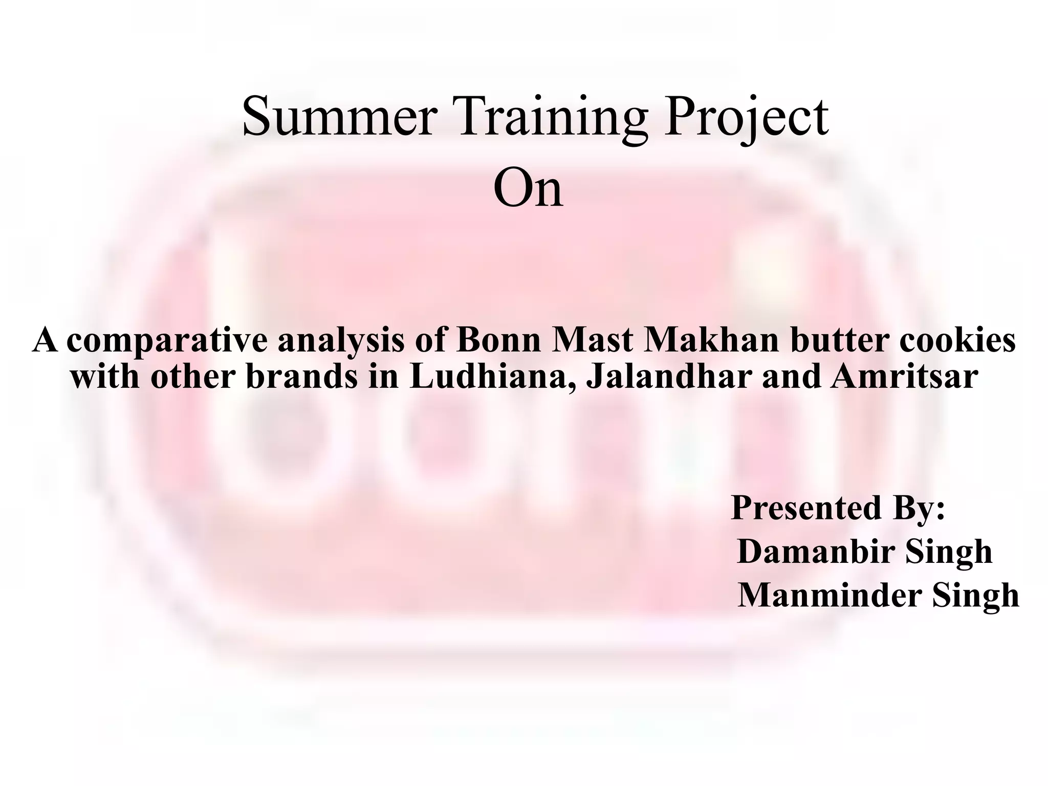 This document presents the results of a study comparing Bonn Mast Makhan butter cookies to other brands in Ludhiana, Jalandhar, and Amritsar. The study found that awareness of the Bonn brand among retailers was low. It also found that Bonn enjoyed high retailer retainability and satisfaction with quality, though awareness of the product name could be improved. The study evaluated the brands on various metrics like quality, brand image, packaging, and service to retailers.