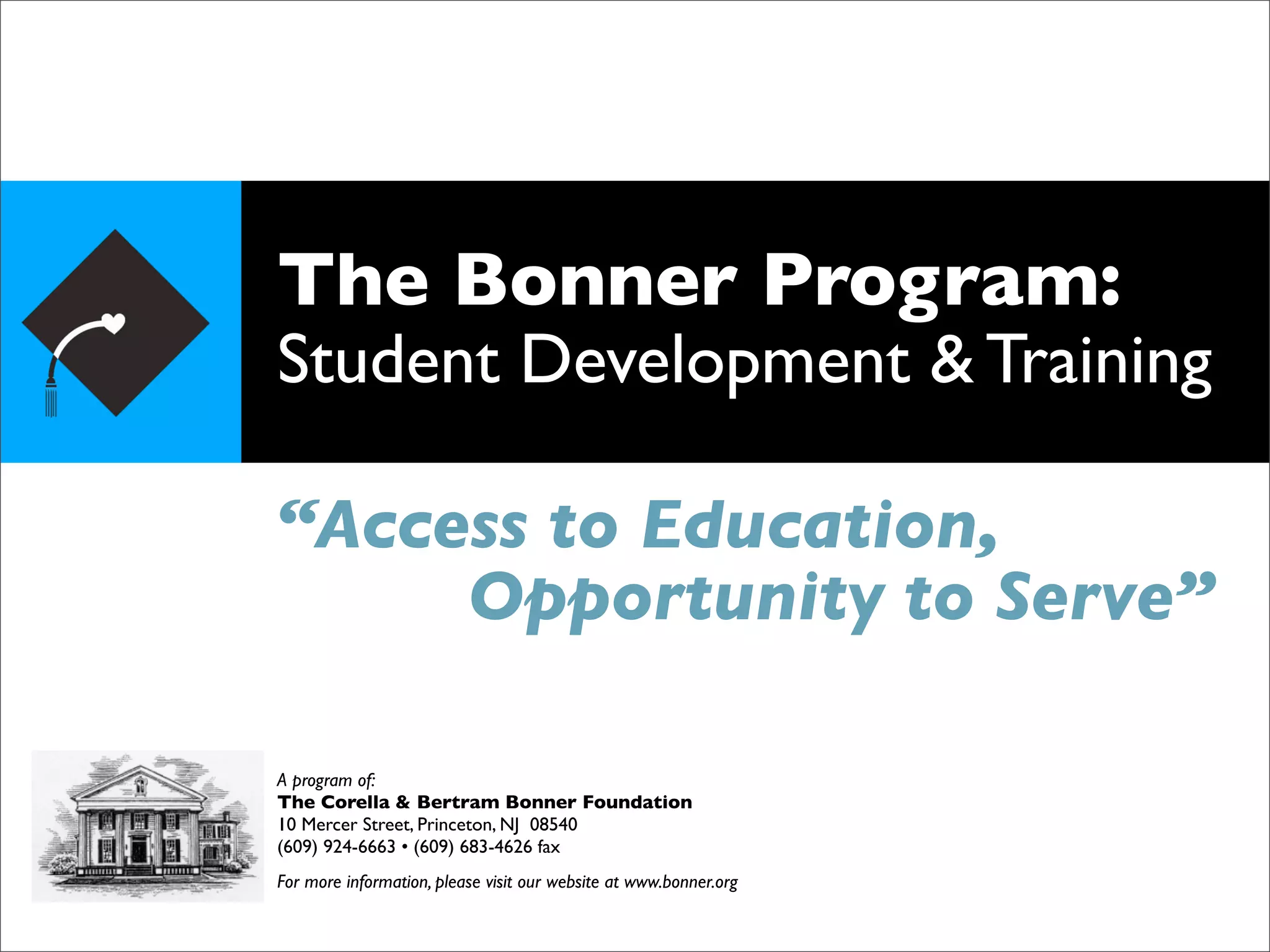 The document provides an overview of the Bonner Program's approach to student development and training. It discusses outcomes focused on experience, skills, values and knowledge. It outlines common commitments, types of meetings including orientations and advising, as well as training modules, resources, best practices, and self-assessment. The goal is to provide students with a holistic journey of personal and professional growth through service learning opportunities and training.