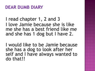 1) The document contains summaries and reactions to several children's books including Dear Dumb Diary, EJ12 Girl Hero Drama Queen, and The Twins at St Clare's.