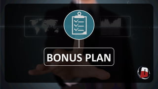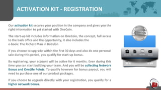 This document describes the bonus plan and ways to earn money with OneCoin. It provides details on the activation kit, packages, and various bonuses including direct sales bonus, matching bonus, startup bonus, OneLife points bonus, and leadership programs. It also outlines the gold bonus, splits, OneCard, and payout conditions.