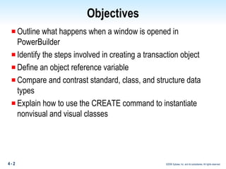 The document discusses instantiating objects in PowerBuilder. It explains that an object instance is created from a class definition using instantiation. When a window is opened in PowerBuilder, it creates an instance of that window class. Objects can be instantiated visually using Open() or CREATE, or non-visually using just CREATE. Structures are automatically instantiated when their variables are declared. The class pool stores class definitions while the instance pool stores each object instance.