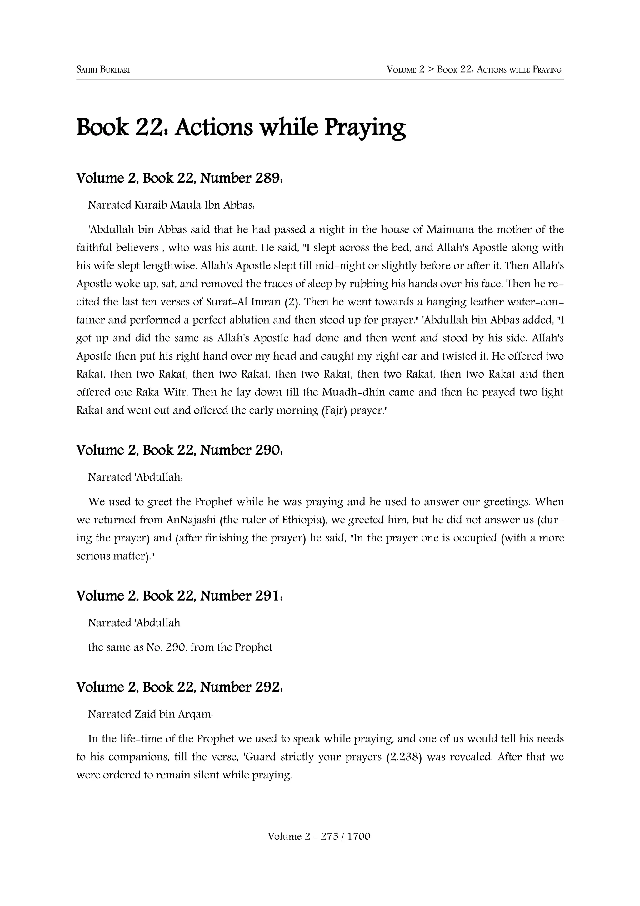 1) The document describes various hadiths from Sahih Bukhari regarding actions that are permitted and prohibited while praying. It discusses how the companions used to speak and greet each other during prayer until it was forbidden by a Quranic verse.