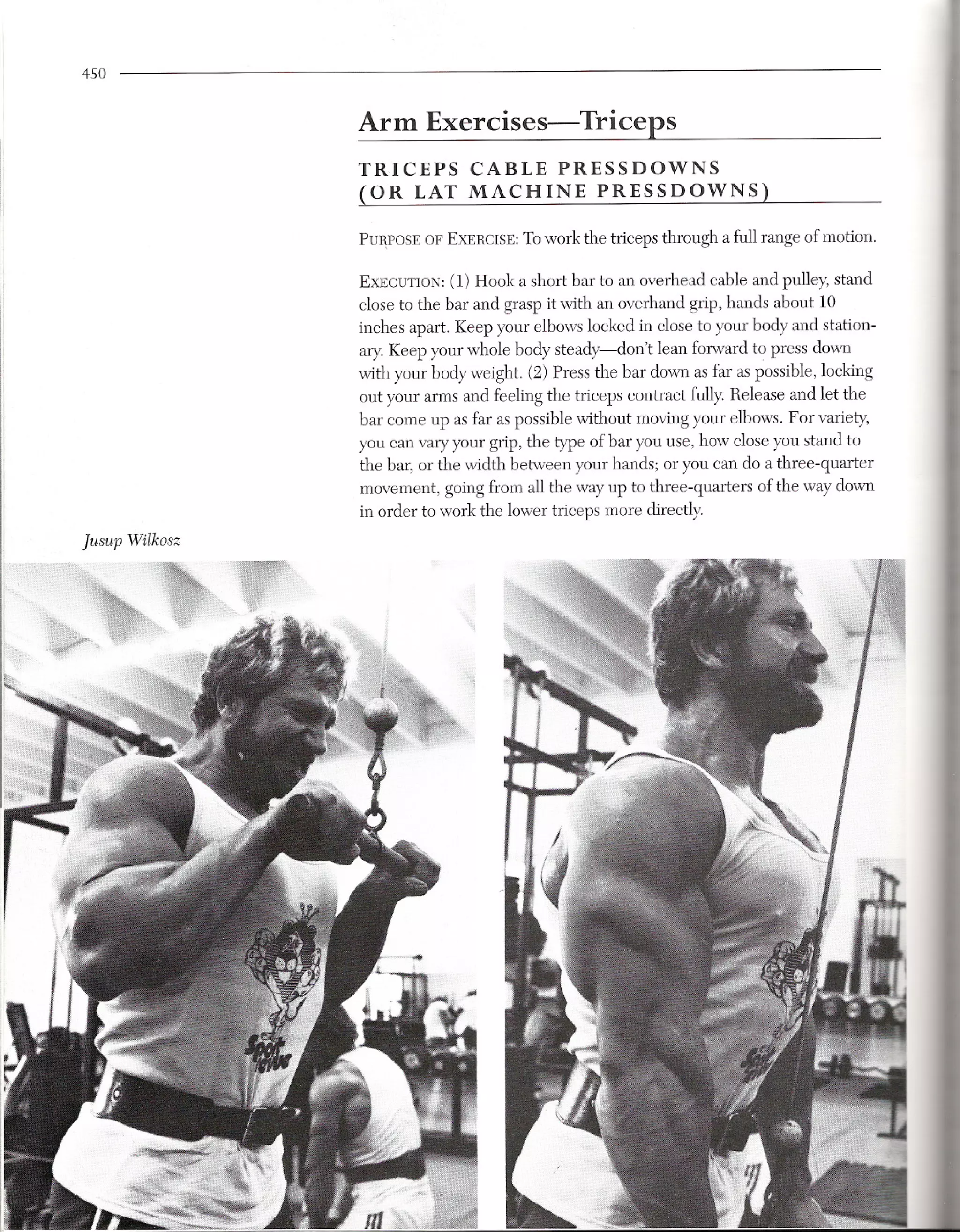 This document provides instructions for several triceps exercises, including cable pressdowns, dips, kickbacks, extensions, and more. Each exercise is described in 1-3 sentences explaining the purpose of the exercise and how to perform it correctly and safely in order to isolate and work the triceps muscles. Photos and diagrams are included to illustrate proper form.