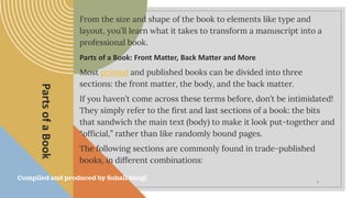 The document discusses the different elements that make up the structure of a book, including the front matter, body, and back matter. It explains some common sections found in the front matter such as the title page, copyright page, dedication page, table of contents, preface, and introduction. It also discusses elements that can be found in the back matter, such as appendices, endnotes, a glossary, index, and information about the author.