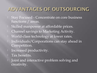 This document provides an overview of bookkeeping and financial business process outsourcing services. It details the key benefits such as focusing on core business functions, leveraging skilled labor at affordable prices, and gaining access to world-class technology. It then lists the specific services offered, including bookkeeping, tax preparation and planning, payroll, and financial reporting. The document concludes with biographies of key staff and details of the software and facilities used.