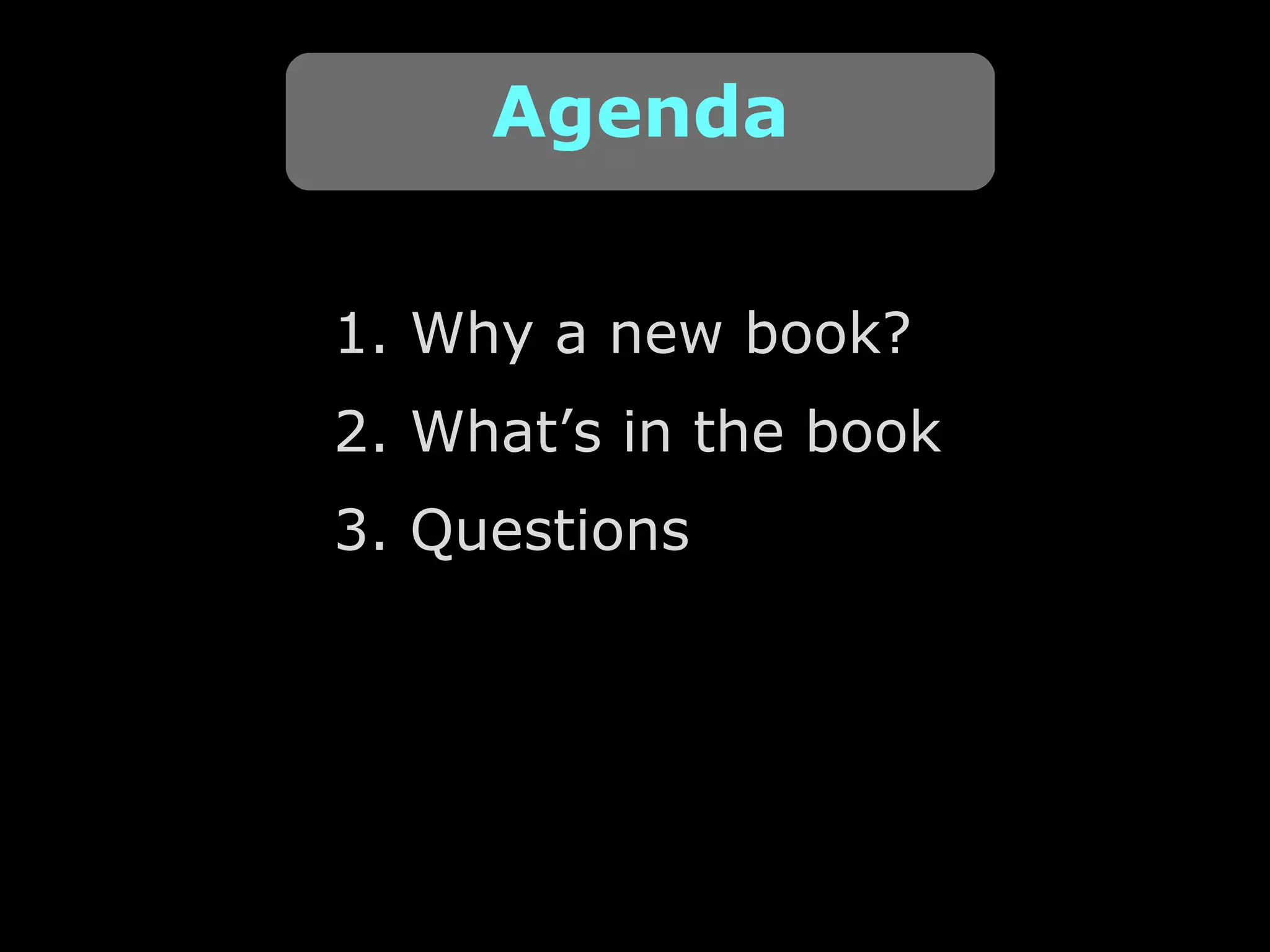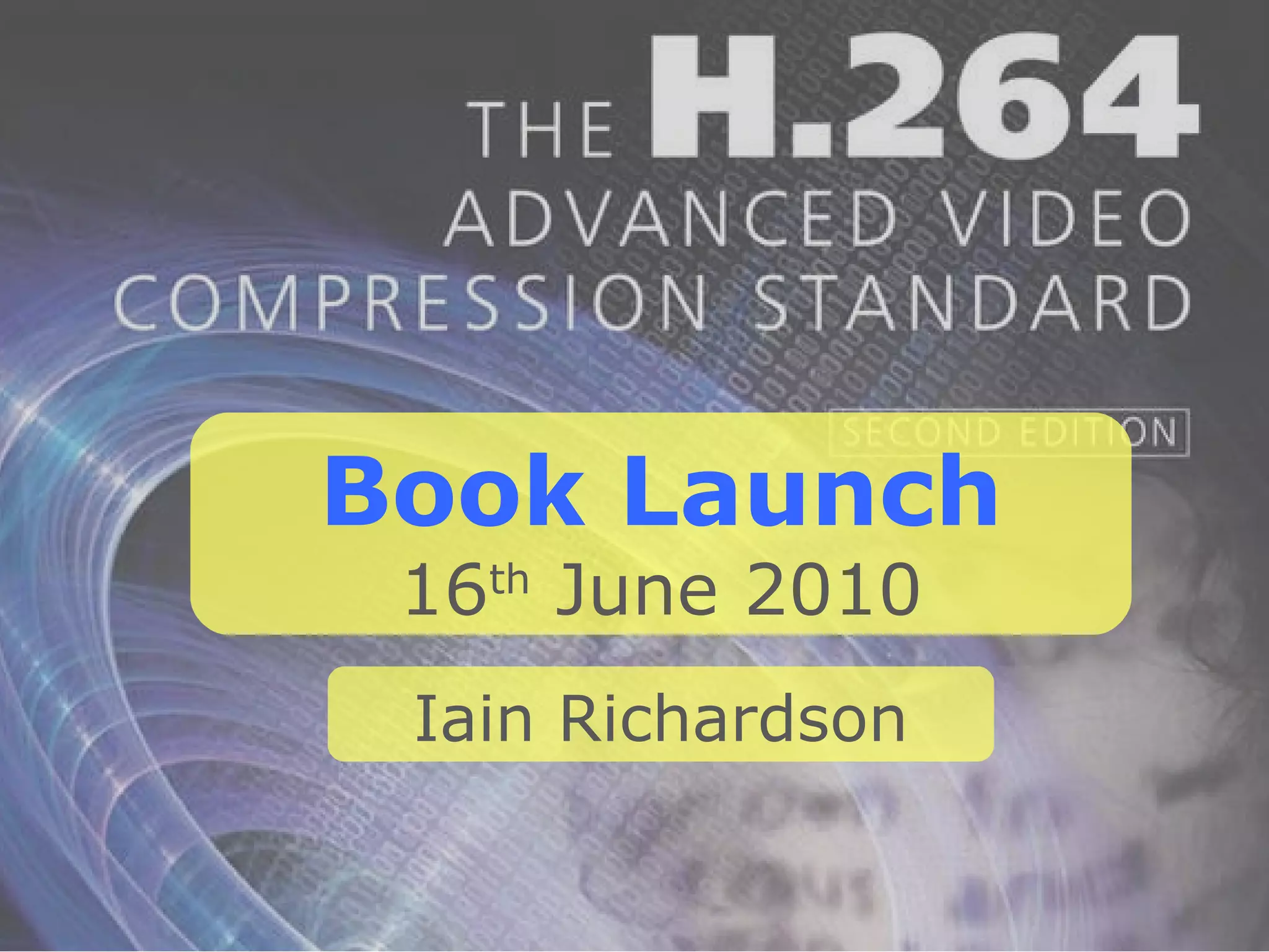 The document outlines the agenda for a book launch event on a new book about H.264 video coding. It begins with an introduction explaining the need for a new book on H.264 - that H.264 is an important but complicated standard and a better understanding is needed. The document then provides an overview of the book's contents, including chapters on H.264 syntax, prediction, transform and coding, conformance and transport, performance, and extensions. It concludes by inviting questions.